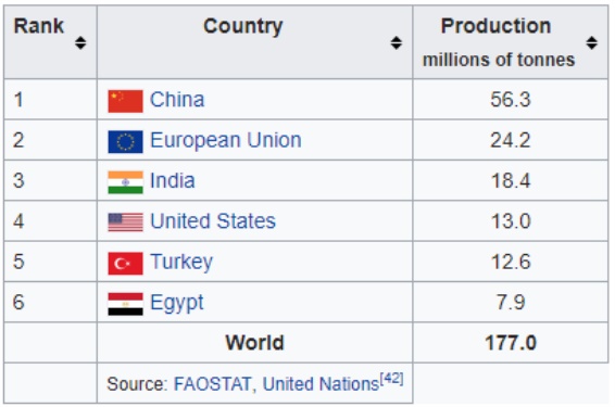 **中國每一種蔬菜產量幾乎都是世界第一,而且跟第二名拉開的差距還不小。**許多東亞特有的蔬菜甚至都沒有上榜,比如韭菜。