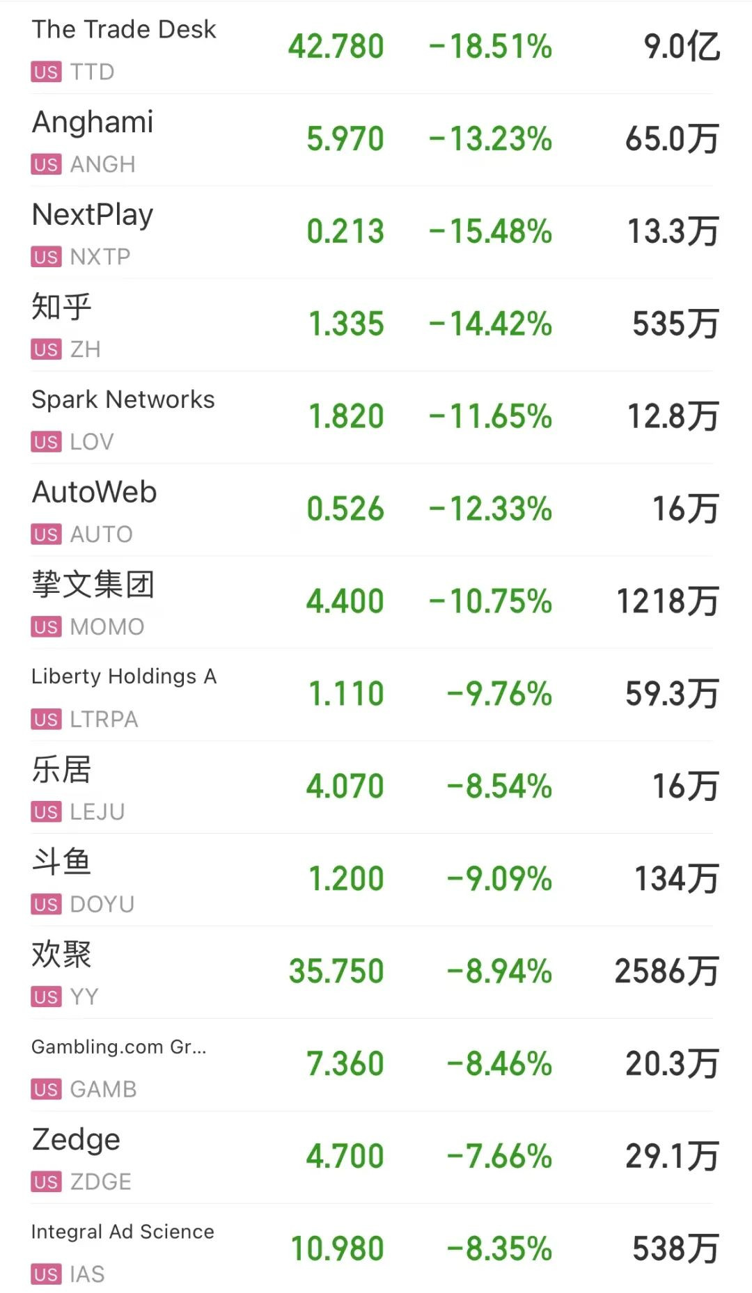 美股互動媒體板塊大跌超6%,連中概股的知乎都跌超14%,鬥魚、歡聚跌幅都在9%左右。