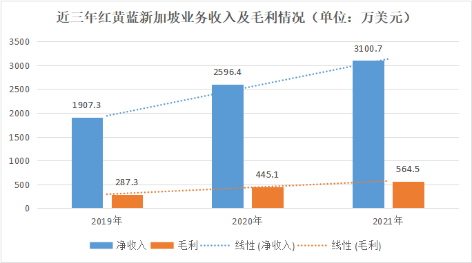 從收入看,2019年-2021年,新加坡業務的營收為1907.3萬美元、2596.4萬美元、3100.7萬美元,呈逐年上漲的趨勢,並分別為總營收貢獻10.5%、23.7%、17.2%。總的而言,新加坡業務發展良好,但在總營收中佔比尚不足以支撐紅黃藍的未來。