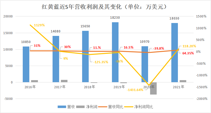 2021年全年,紅黃藍實現淨利潤680萬美元,實現扭虧為盈。這已是其近段時間難得的好消息。