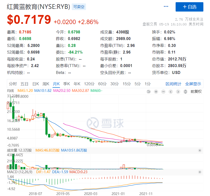 此次突然宣佈剝離近半資產,讓資本市場對紅黃藍的未來更加悲觀。4月,因連續30個交易日ADS價格低於1美元,紅黃藍收到紐交所退市警示函。收到通知後,公司必須在六個月內將其股價和平均股價恢復到1美元以上。對此,紅黃藍表示將監控其ADS市場狀況,並考慮採取各種措施來糾正對交易價格造成不利影響的違規行為,並避免任何潛在的退市。截至5月19日,紅黃藍的股價為0.72美元,與其最高點31.8美元相比,已經跌去97.8%,昔日的幼教巨頭市值也僅剩2012.7萬美元。