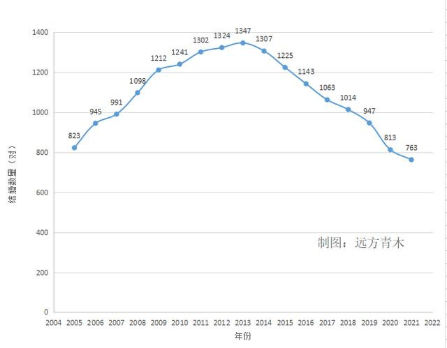 從公開數據來看,中國的結婚人口數量高峯出現在2013年,那一年有1347萬對新人結婚,隨後一路走低,2021年僅有763萬對新人結婚。