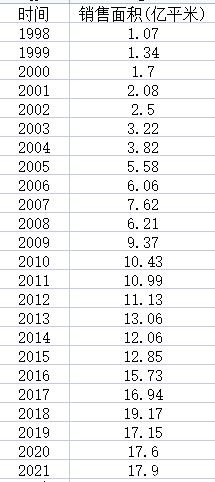 1998~2021年,中國共銷售正規商品房225.58億平米,毛估2.25億套房。