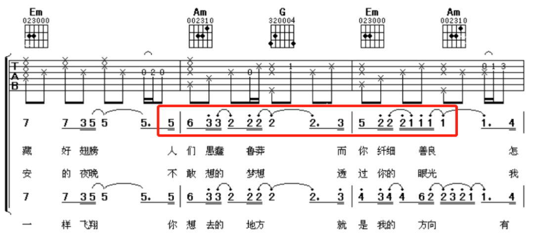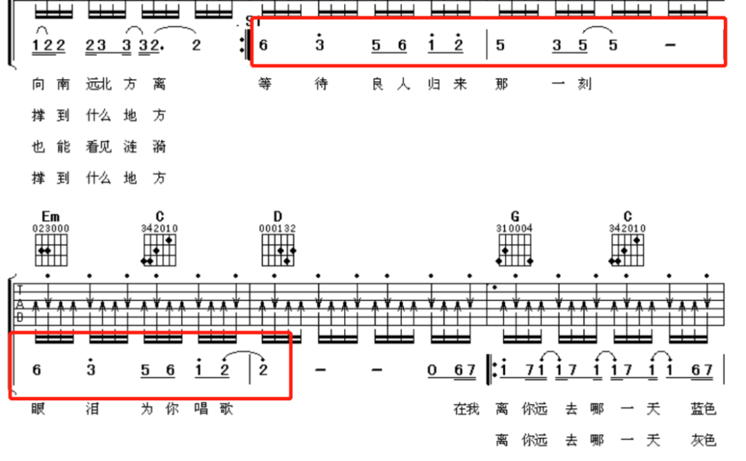 比如《千年淚》這首作品,主歌和過渡段的樂句,從譜面上來看其實很相似(紅色):
