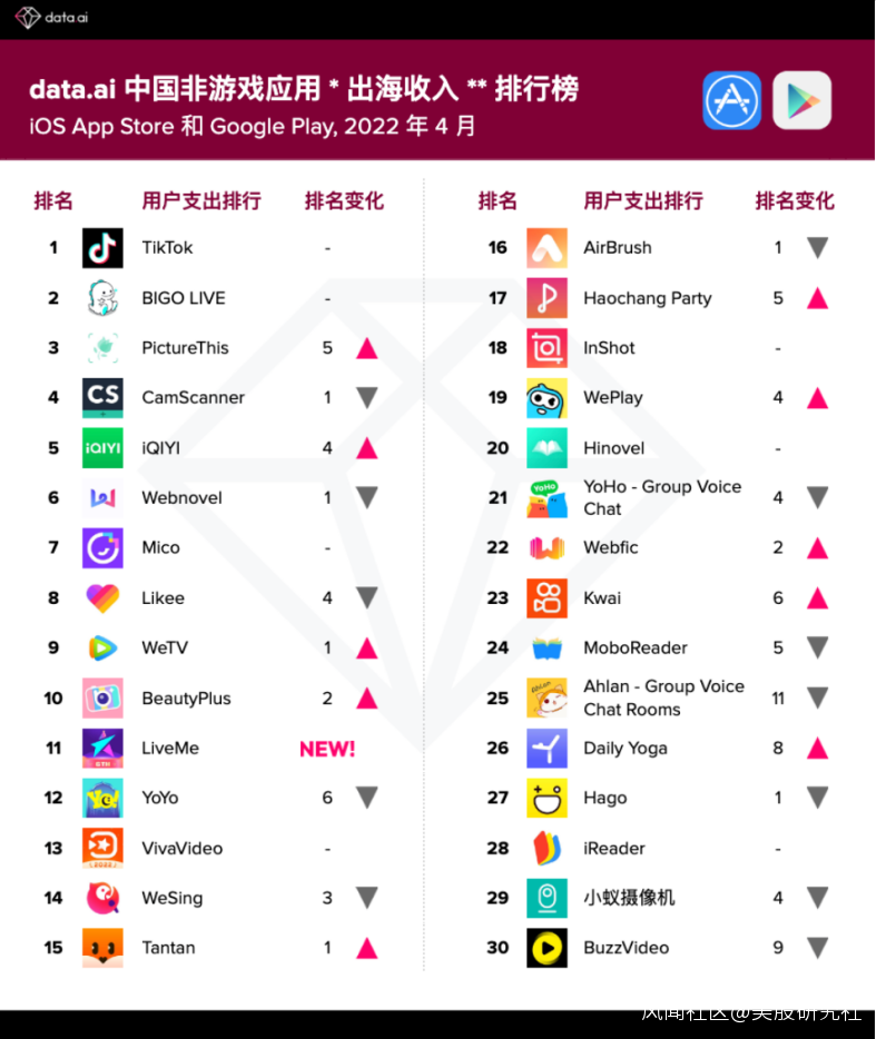 data.ai在3月發佈的《中國非遊戲應用出海收入排行榜》中,愛奇藝排名第九,騰訊視頻位列第十。到了4月,隨着愛奇藝在泰國等東南亞市場進一步表現優異,其排名攀升至第五。