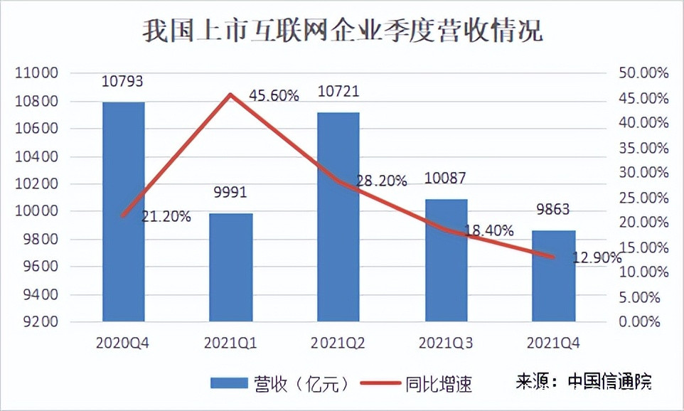 而且,這份成績來得正是時候。眾所周知,國內互聯網紅利正趨於消失。在用户與業務增長乏力下,資本對互聯網公司不確定性的顧慮,導致後者市值正急速下降。根據中國信息通訊研究院的數據顯示,截至2022年3月底,我國上市互聯網企業總市值為9.9萬億元,較去年年底下降20.2%。2021年四季度,我國上市互聯網企業營收為9863億元,同比增速為12.9%,較上年同期下降8.3個百分點。
