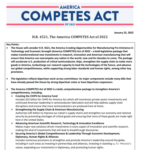 從去年年中開始,美國就在規劃一個與產業競爭有關的重要法案。今年2月和3月份,美眾議院和參議院分別投票通過了《2022美國競爭法案》。現在上下院正在協調法案的文本差異,儘管進度不快,但最後通過只是時間問題。