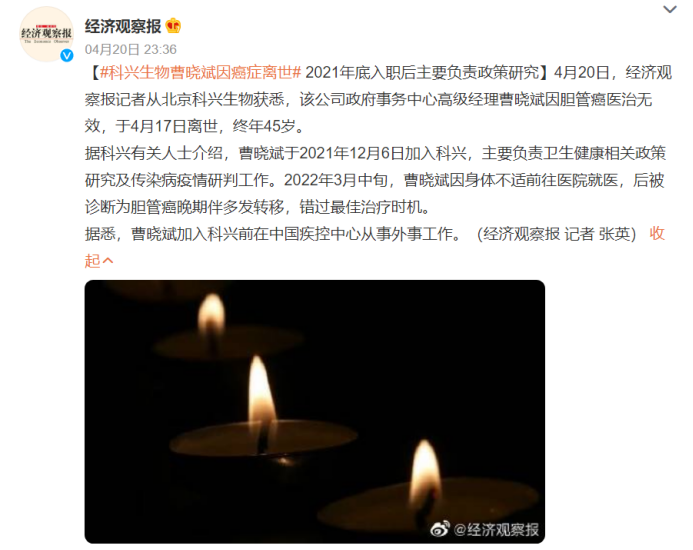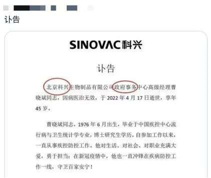 4月19日,一則訃告在網上流傳。該訃告顯示,北京科興生物製品有限公司政府事務中心高級經理曹曉斌因病醫治無效,於2022年4月17日逝世。