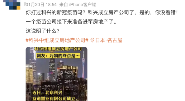今年1月,科興要進軍房地產的消息在互聯網大量傳播,網友驚呼“資本的盡頭是房地產”,消息越傳越離譜,一些人更是調侃科興“打疫苗送房”。