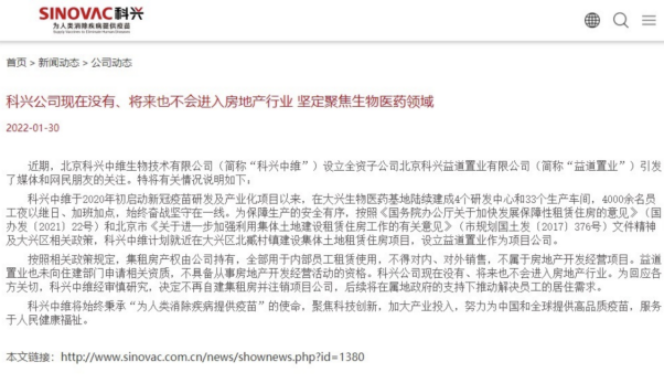科興確實成立了一家名為北京科興益道置業的全資子公司,對此科興的回應是,公司現在沒有、將來也不會進入房地產行業。該註冊公司主要是計劃建設集租房,用於內部員工租賃,滿足員工住宿需求。