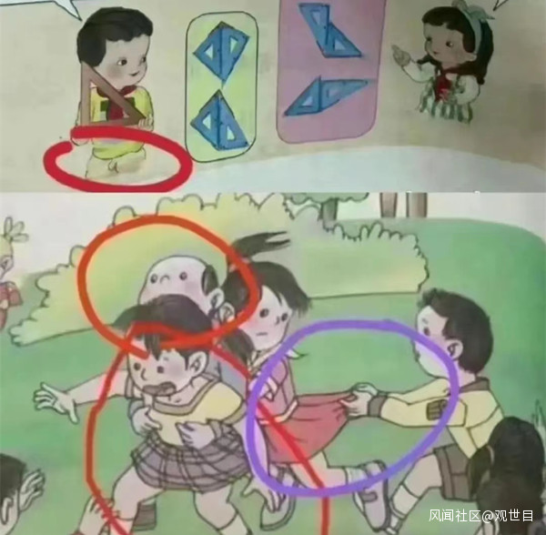 2·有問題的不僅是教材,包括課外讀物,玩具……其中危害最大的一類是性教育教材。提倡性教育本身是正確的,但幾乎能通過的教材都夾帶私貨,把本該灌輸正確價值觀的性教育變成西方性啓蒙那一套,(説白了就是性誘惑,性鼓勵。),並且還有我們近年來常見的女拳思想,偷換概念,煽動對立,這些都是10多年前就出現在書本里的。這類思想也不是集中灌輸的,通過配圖或言辭進行潛移默化的影響,所以比較容易通過審核。