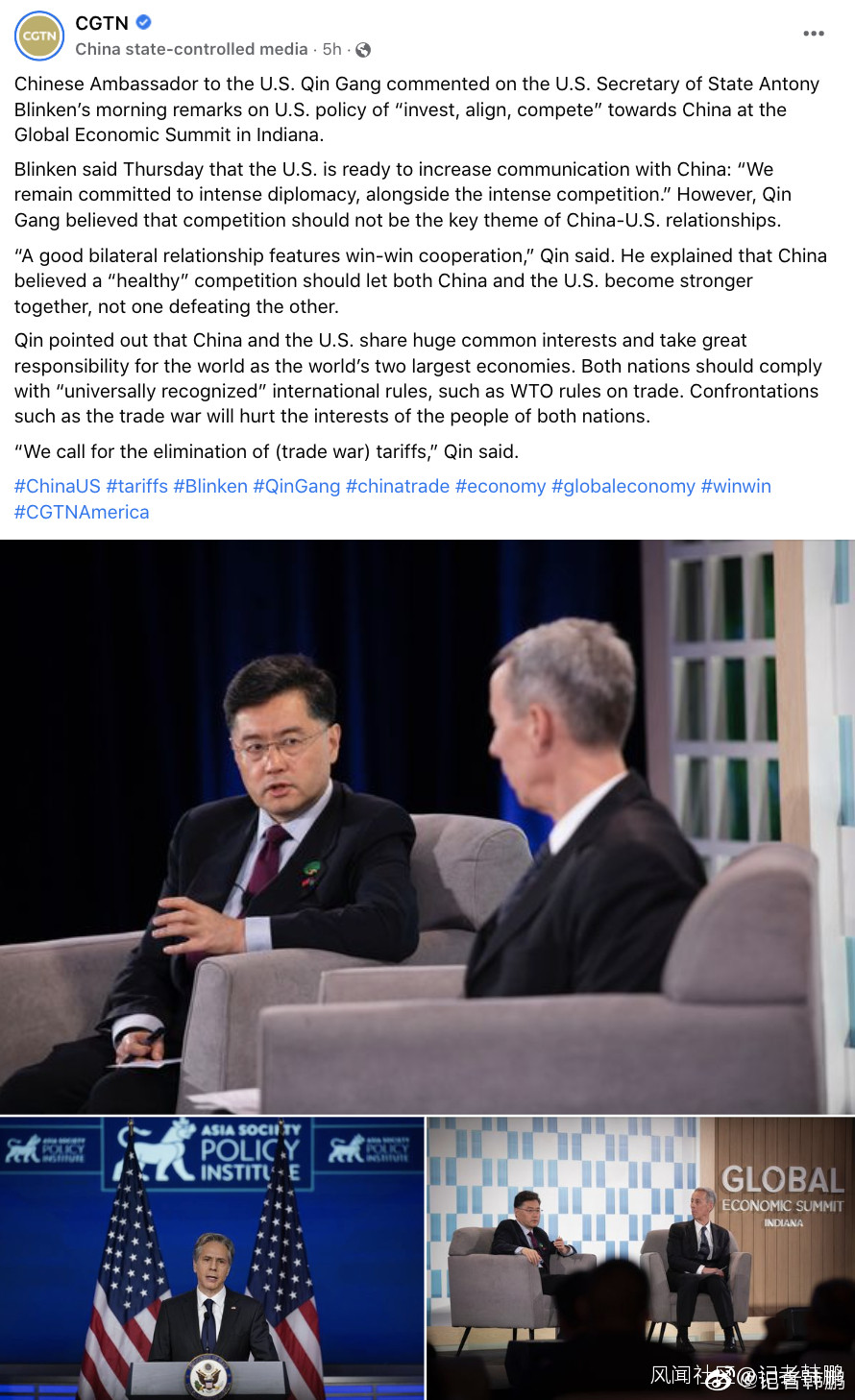秦剛大使今天在美國印第安納州出席全球經濟峯會,説了很多實在話!他坦率承認疫情導致中國經濟下行壓力大,但“新冠影響是暫時的,中國經濟向好的基本盤是一直不變的。”