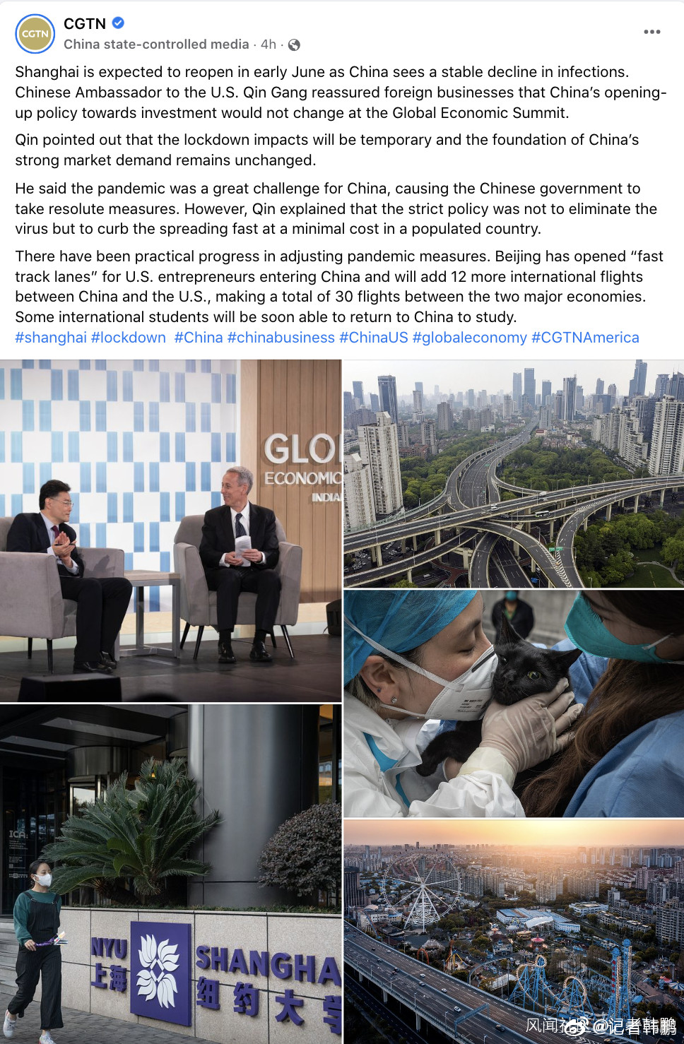 ——“過去一週,我們看到上海確診數字持續下降。據悉6月初開始,上海社會面就將有序開放了。這對我們都是好消息。”