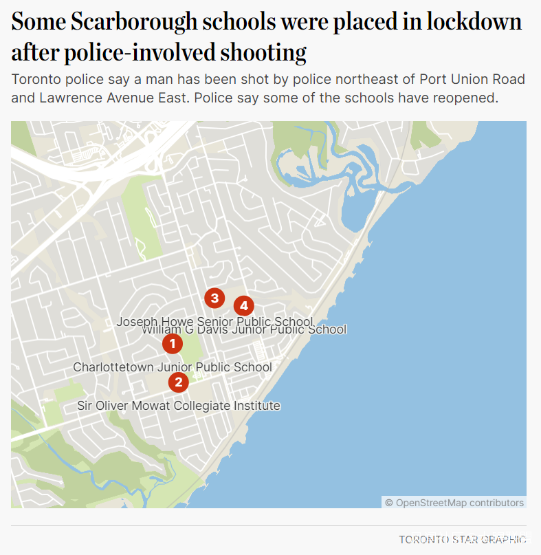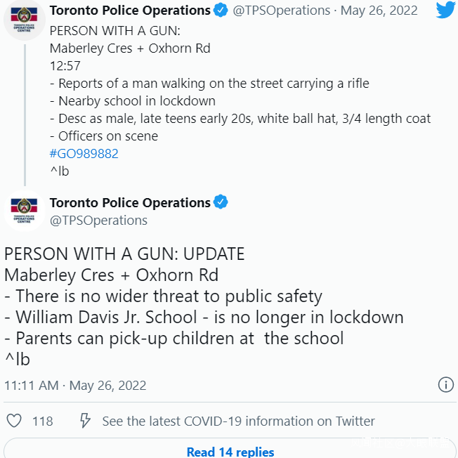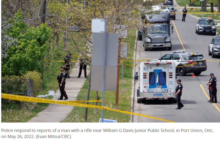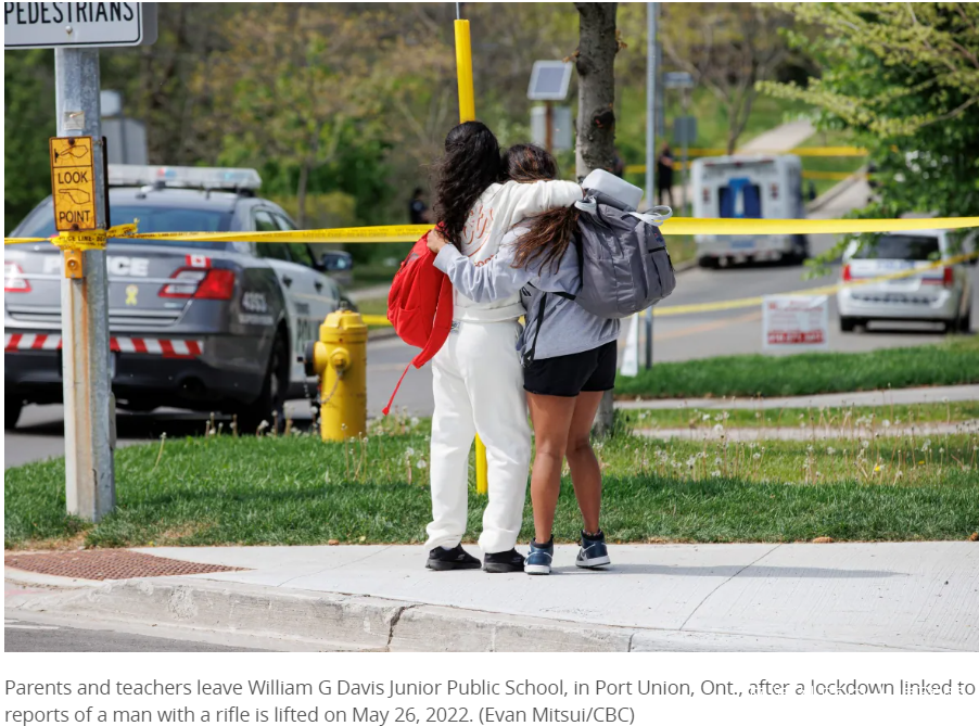 今天(5月26日),多倫多幾所學校被迫封鎖後,一名男子被警察開槍打死,此前有報道稱該地區有人拿着步槍,在學校附近走來走去。