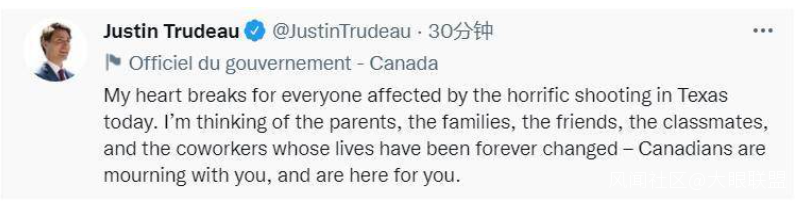 在加拿大**,總理特魯多也表示,他對事件感到心碎。**“學生、家長、老師和整個社區的生活都因這一難以想象的事件而永遠改變。發生這可怕的事件,整個加拿大都與我們的美國友人一起深感悲痛。”