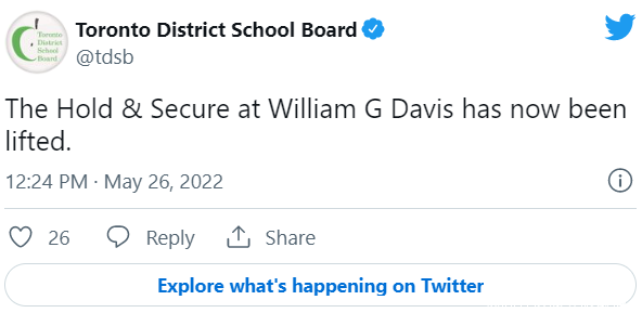 多倫多公校教育局(Toronto District School Board)則推文,William Davis Junior Public School已經解除封鎖,**有大批家長緊急趕到學校接孩子回家。**其他學校也陸續解封。
