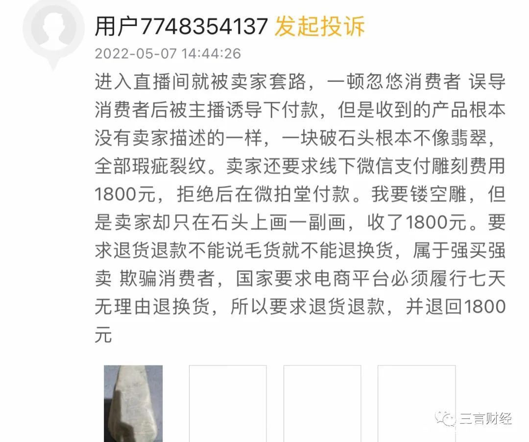 有網友投訴,在微拍堂平台,一進入直播間就被賣家套路,一頓忽悠誤導後,被主播誘導下單付款。然而,收到的產品和賣家描述的根本不一樣,“一塊破石頭根本不像翡翠,全部瑕疵裂紋”。這名網友稱想買鏤空雕,但實際卻只是在石頭上畫了一副畫,收了1800元。