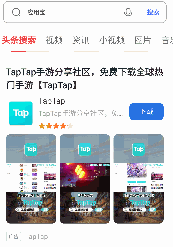 打開瀏覽器,搜索應用寶。TapTap 廣告,新魔神大陸廣告,再來個TapTap廣告。。。
