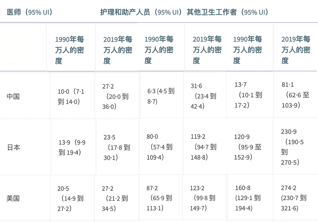 根據該研究公佈的中國數據,截至2019年中國每萬人有27.2名醫生,比30年前上升2.7倍,這與中國國家衞健委此前公佈的數據相當,2019年年底,我國醫師總數達386.7萬人。