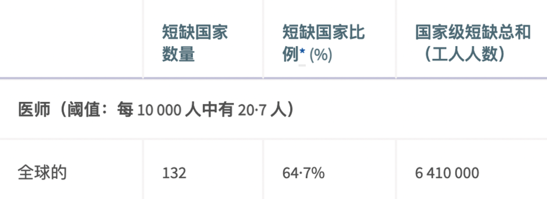 2022年5月23日,頂刊《柳葉刀》發佈的一項研究顯示,全球醫療衞生工作者人數短缺情況令人望而生畏。截至2019年,若以全民健康覆蓋(UHC)可及至少80%的人為標準,全球還缺約640萬名醫生、3000萬名護士與助產士、290萬名藥學衞生人員。