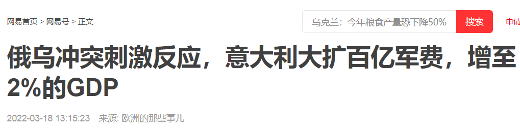 意大利之前的情況與德國類似,國防開支佔GDP的1.41%(約244億歐元)。3月16日,意大利議會以壓倒性優勢投票決定將國防開支佔比提升至2%。