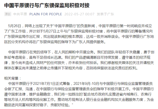 5月26日,廣東銀保監局宣佈,“中國平原銀行”涉嫌非法設立銀行業金融機構、非法從事銀行業金融機構的業務活動。中國銀保監會及其派出機構未曾審批許可過“中國平原銀行”籌備、設立並經營有關銀行業金融機構業務。