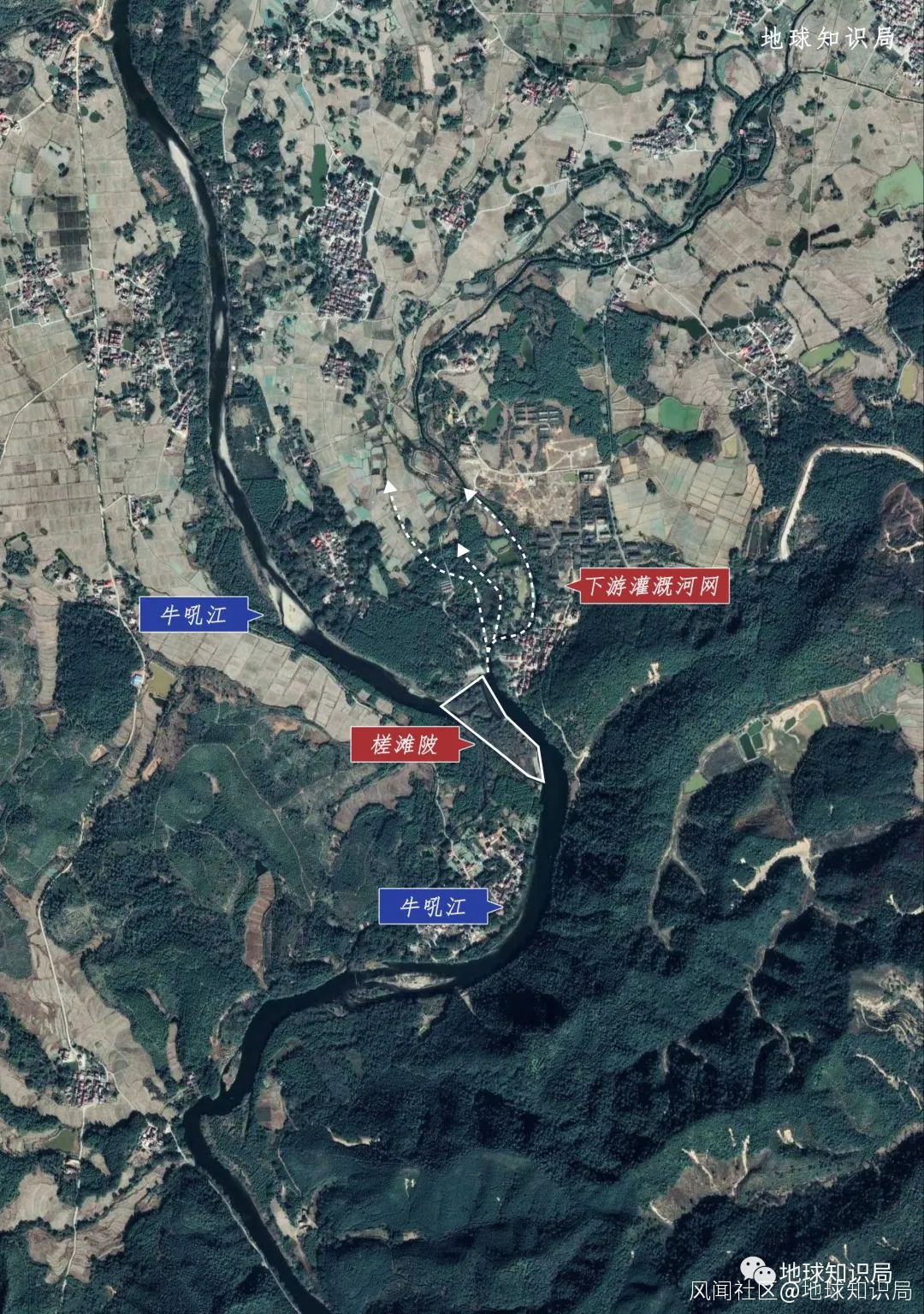 牛吼江由南至北,在槎灘陂一分為二