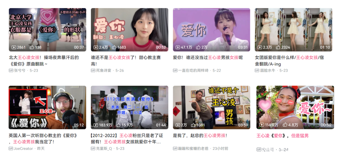 UP主們似乎永遠沒有創作瓶頸,這些王心凌男孩、女孩們的硬核二創,不僅拼湊出了“愛你”的形狀,也讓我們看到了這個時代年輕人閃閃發光的靈魂。