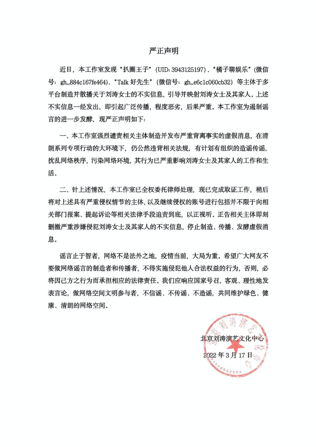 當時,劉濤工作室第一時間站出來發佈聲明闢謠。