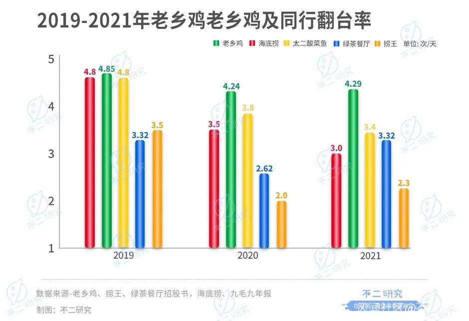 疫情之下、行業震盪,餐飲企業的核心指標——翻枱率遭嚴峻考驗。根據招股書數據,2019-2021年老鄉雞翻枱率分別為4.85次/天、4.24次/天和4.29次/天,整體處於下滑趨勢。不過作為快餐品牌,老鄉雞的翻枱率在行業內仍然較高。根據年報及招股書,2019年~2021年,海底撈翻枱率分別為4.8次/天、3.5次/天和3.0次/天;太二酸菜魚翻枱率4.8次/天、3.8次/天和3.4次/天;綠茶餐廳翻枱率為3.32次/天、2.62次/天和3.32次/天;撈王翻枱率為3.5次/天、2.0次/天和2.3次/天。