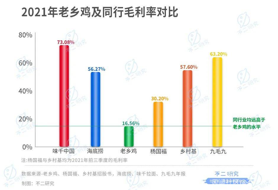 但即使在同行間,老鄉雞的毛利率水平也毫無優勢。據2021年財報,海底撈(06862.HK)、味千中國(00538.HK)、九毛九(09922.HK)的毛利率分別為56.27%、73.08%和63.2%;2021年前三季度,同樣衝刺上市的楊國福和鄉村基毛利率分別為30.2%和57.6%,均遠高於老鄉雞的水平。