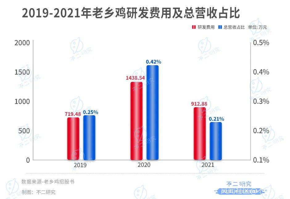 招股書顯示,2019-2021年老鄉雞研發費用分別為719.48萬、1438.54萬和912.88萬元,佔營業收入比例分別為0.25%、0.42%和0.21%。近年來老鄉雞也並無出圈新品,僅憑老味道或許難再征服新食客。