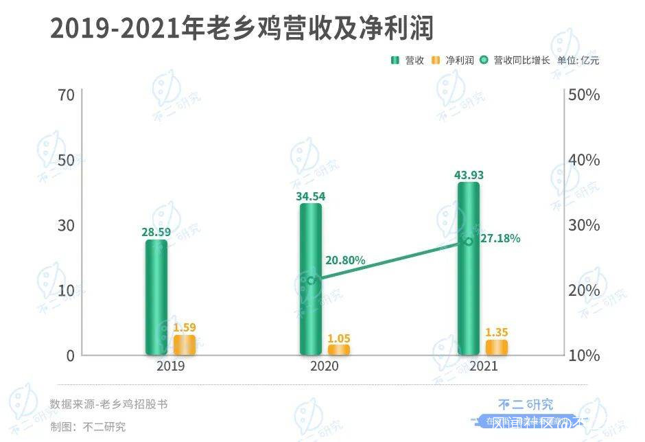 招股書顯示,2019-2021年,老鄉雞的營收為28.59億、34.54億和43.93億元,正值高速增長;淨利潤分別為1.59億、1.05億和1.35億元,尚未恢復疫前水平。