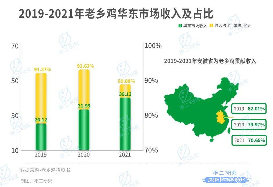 招股書顯示,2019-2021年,來自華東市場的收入分別為26.12億元、31.99億元和39.13億元,分別佔到當期總營收的91.37%、92.63%和89.08%;其中安徽一省為老鄉雞貢獻的收入佔比就高達82.01%、79.97%和70.65%。