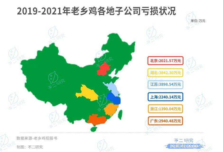 門店擴張不夠的窘境,阻礙了該模式的全國化推廣,又將進一步分化區域間盈利能力。除安徽總部外,老鄉雞其餘各地的子公司均已陷入虧損。招股書顯示,2021年湖北、江蘇、上海、浙江、廣東、北京的老鄉雞子公司分別虧損3842.30萬、3898.54萬、2240.14萬、1390.04萬、2940.48萬和2021.57萬元,合計1.63億元。