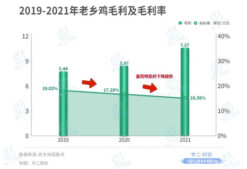 同時,毛利率也顯示出老鄉雞的短板。根據招股書,2019-2021年,老鄉雞整體毛利率分別為19.02%、17.28%、16.56%,呈現明顯的下降趨勢。對此,老鄉雞在招股書在解釋稱是受原材料成本上升、人工成本上升等因素影響。