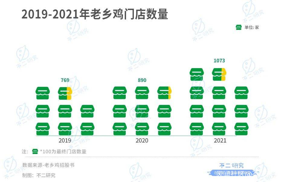 根據招股書數據,2019-2021年底,老鄉雞門店數量分別為769家、890家和1073家。