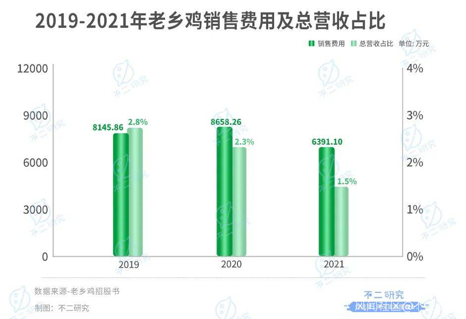 招股書顯示,2019-2021年老鄉雞營銷費用分別為8145.86萬、8658.26萬和6391.10萬元,佔總營收比重分別為2.8%、2.3%和1.5%,遠高於同期謀求上市的鄉村基以及營收總體規模相近的九毛九。