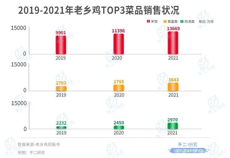 從產品構成來看,老鄉雞以肥西老母雞湯產品為特色,但其最為暢銷的產品竟是米飯。2021年,老鄉雞銷售量Top3的菜品分別是米飯、蒸蛋和雞湯,分別售出1.37億、0.36億和0.30億份。