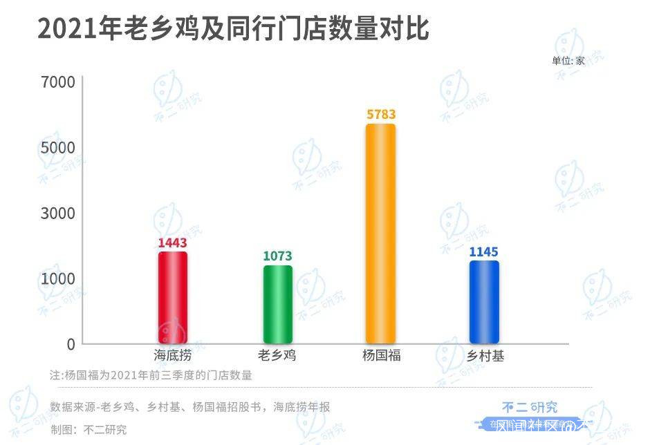相比同賽道玩家,老鄉雞的門店規模並不算出眾。截止2021年,鄉村基擁有門店數量1145家;海底撈門店數量共1443家;2021年三季度,楊國福門店總數已達到5783家。