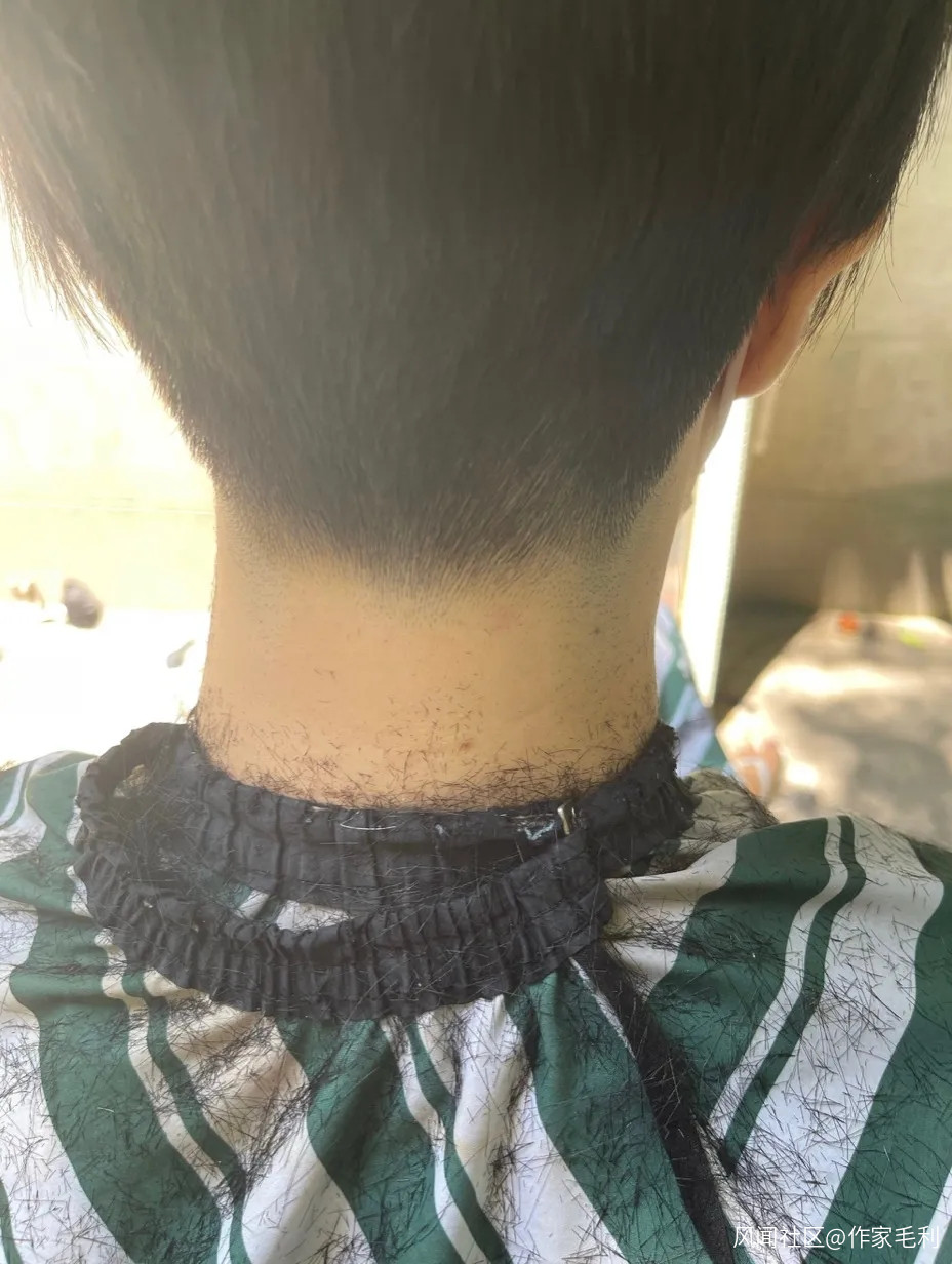 師傅讓我來坐,圍上一塊綠條紋的圍布,我説,就按現在這樣,剪短一點吧。