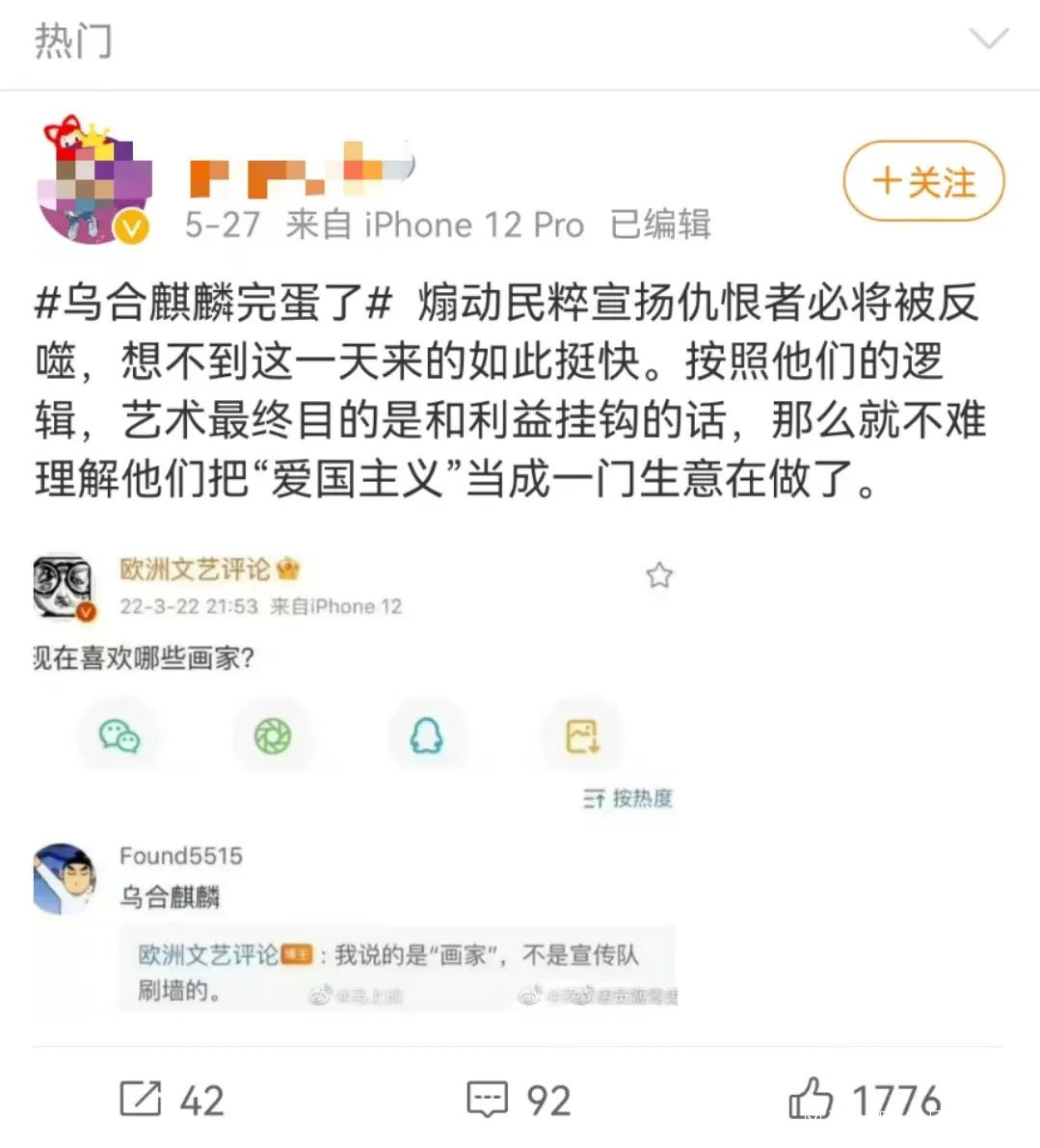 這畫不是烏合麒麟畫的,這畫也不是烏合麒麟審核的,如果我們按照境外水軍的希望,過於聚焦批判、討伐烏合麒麟,是不是就給某些人轉移視線成功了?!