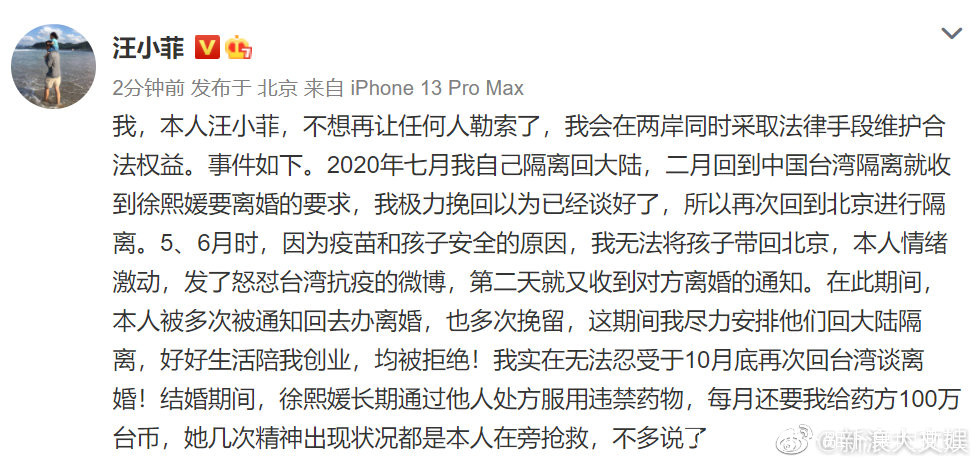 汪小菲發文回應出軌後再發文,回顧與大S離婚時間線,稱2020年7月他隔離回大陸,2021年2月回到中國台灣隔離就收到大S要離婚的要求,並稱大S長期通過他人處方服用違禁藥物。