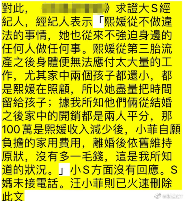 經紀人表示大S從第三胎流產之後身體便無法應付太大量的工作,尤其家中兩個孩子都還小,都是大S在照顧,所以她儘量把時間留給孩子,至於每月100萬台幣是汪小菲自願負擔的家用費用,“據我所知他們倆從結婚之後家中的開銷都是兩人平分,那100萬是熙媛收入減少後,小菲自願負擔的家用費用,離婚後依舊維持原狀,沒有多一毛錢,這是我所知道的狀況。”