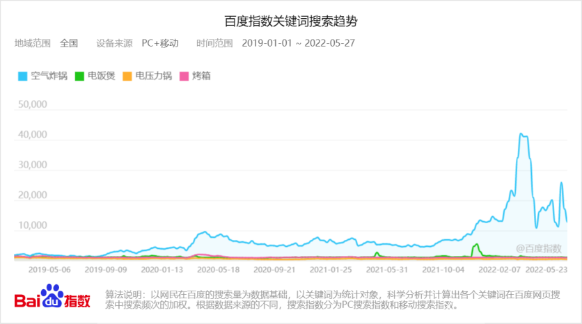可以看到,從空氣炸鍋真正進入中國消費者視野算起,該品類發展不足10年。而線上流量傳播疊加疫情影響,使得空氣炸鍋快速“出圈。”