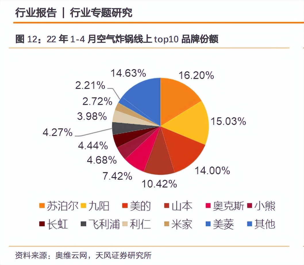 2022年1-4月線上空氣炸鍋品類美的、蘇泊爾、九陽CR3的份額為45.23%,依舊領跑全行業。