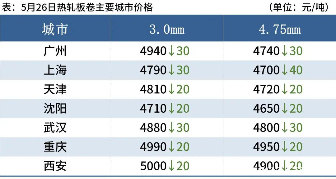 **熱軋板卷:**5月26日,全國24個主要城市4.75mm熱軋板卷均價4835元/噸,較上個交易日下跌30元/噸。