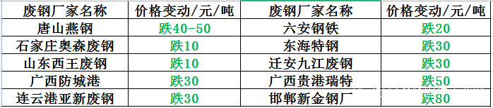 廢鋼:26日,廢鋼仍維持下跌狀態,暫未出現反彈的影子。26日,廢鋼廠調價信息如下: