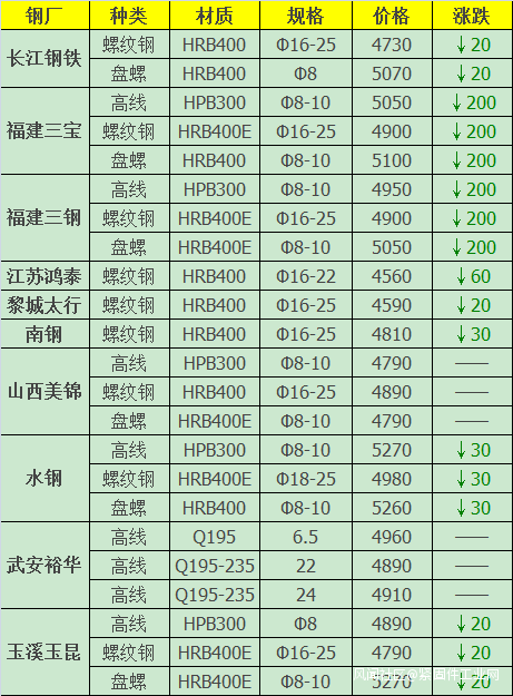 26日,共21家鋼廠調價,其中:下調13家,佔比61.9%,調價幅度20-200元/噸;降幅最大的福建三寶建材,下調200元/噸;