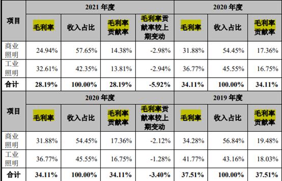 期內,民爆光電的主營業務毛利率分別為 37.51%、34.11%和 28.19%,也就是説,單從2020年至2021年,其毛利率就下滑了將近六個百分點。更細來看,公司無論是商業照明業務,還是工業業務,這三年毛利率都明顯下滑。